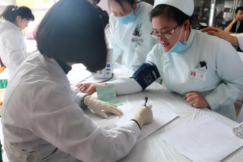 市血液中心工作人員正在給獻(xiàn)血人員測(cè)量血壓